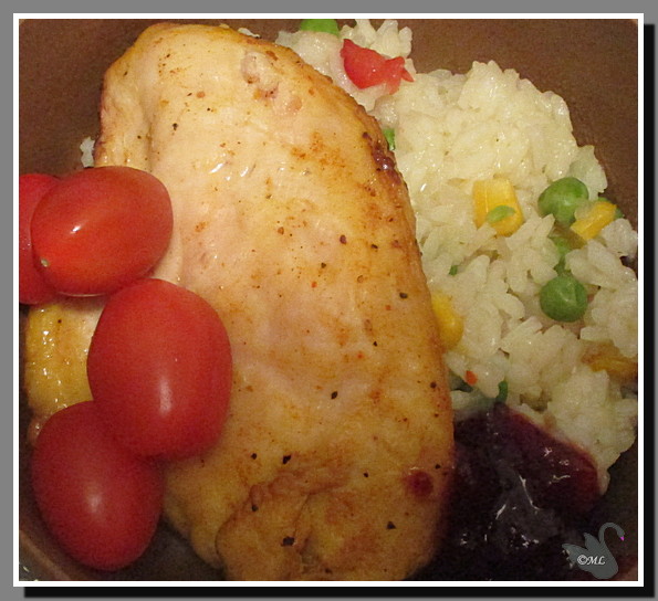 Tänään kanaleikettä kypsennettynä pöhöttimessä (180° ja n. 22min.) sekä riisiä, jonka joukossa herne-maissi-paprika-sekoitusta ja sipulia sekä mausteita. Lisänä pieniä tomaatteja ja puolukkahilloa.