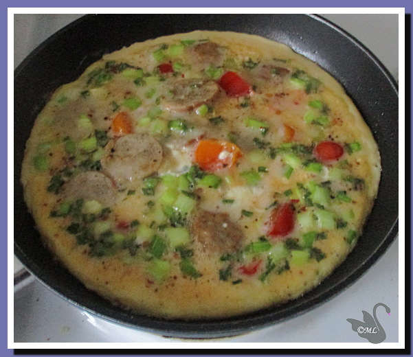 Taas ollaan laiskan kokin touhuilla liikkeellä. Värkkäsin nopean munakkaan, johon laitoin joukkoon vähän kaikenmoista… kevätsipulia, ruohosipulia, minitomaattia puolikkaina, broileripyöryköitä puolitettuina ja tietenkin mausteet. Kyllä se ihan täydestä meni. 😋