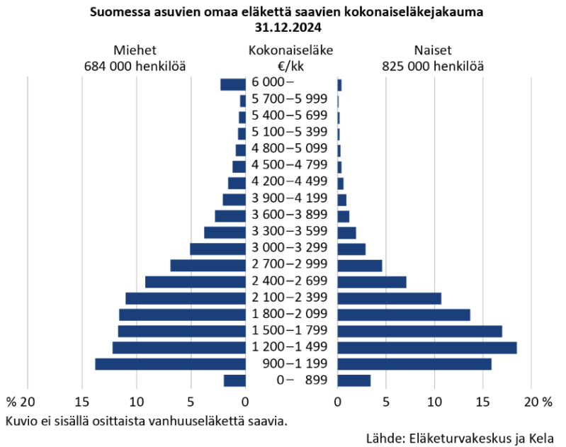 Se on sitten julkaistu, viimeisin eläketilasto. Keskimääräinen eläke miehillä on 2 349 euroa kuukaudessa. Naisten keskieläke oli 1 893 euroa. Eläketurvan ja Kelan julkaisemasta kaaviosta näkee selvästi, miten valtaosa eläkkeistä jää kerrottujen keskieläkkeiden summan alle. Tämä totuus on hyvä kaikenlaisten poliitikkojen ja päättäjien muistaa lausuntoja antaessaan ja päätöksiä tehdessään! Ja on hyvä muistaa sekin, että hintojen ja alv:n korotukset sekä monien tukien pienennykset koskevat myös eläkeläisiä. Tämä muistutus vain siksi, kun eräät poliitikot uhoavat eläkeläisten saavan liian suuria tuloja. Sitä paitsi, pientä palkkaa (esim. monilla naisvaltaisilla aloilla) nauttineet eivät ole voineet koota omaisuuksia työelämässä ollessaan. Työtä on kuitenkin tehty -monet hyvinkin nuoresta alkaen-, jotta edes jonkinlaisen eläkkeen aikanaan saisi…
