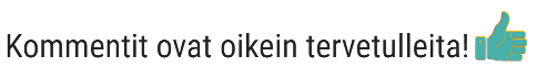 🍀Kun kommentoit ensimmäistä kertaa, kommenttisi menee ensin ylläpidon hyväksyttäväksi. Kun sinulla on yksi hyväksytty kommentti (samalla sähköpostiosoitteella, Facebook- tai WordPress-tunnuksella), jatkossa kommenttisi menevät suoraan nettiin.