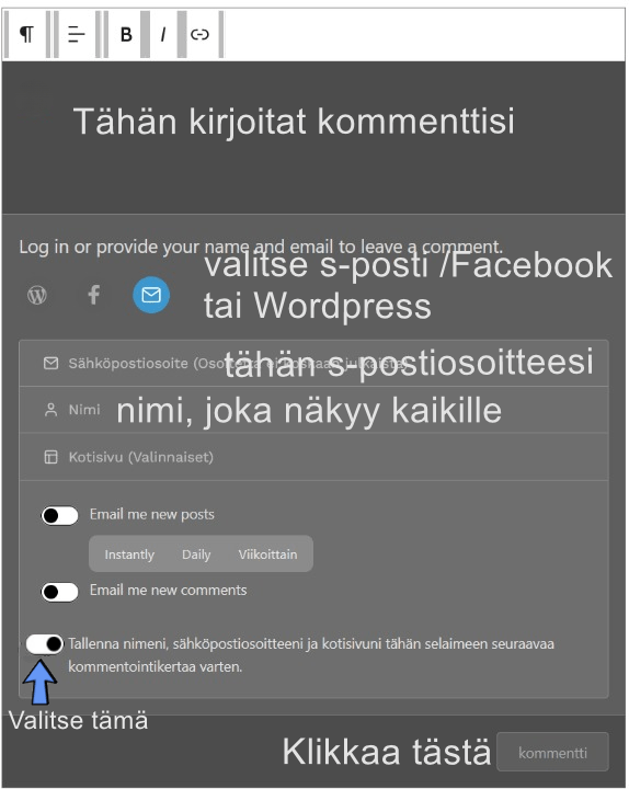 Voit valita näkyvän nimen (pelkkä etunimi tai nimimerkkikin käy), kun laitat kommenttiisi sähköpostiosoitteesi (ei julkaista) tai Facebook-tunnuksesi tai WordPress-tunnuksesi.